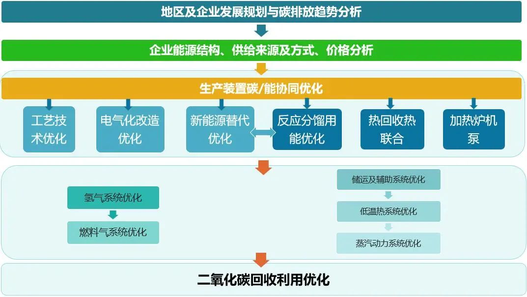 3、基于過程系統(tǒng)工程理念,采用系統(tǒng)性的碳優(yōu)化技術路線,以碳排放最小化為目標,研究制定企業(yè)碳優(yōu)化成套技術解決方案。