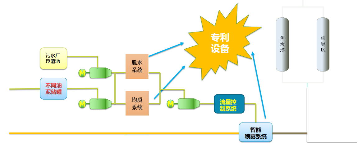 該技術(shù)的核心設(shè)備為均質(zhì)系統(tǒng)和3S智能?chē)婌F系統(tǒng)。均質(zhì)系統(tǒng)可以將污水車(chē)間的三泥以及儲(chǔ)運(yùn)車(chē)間的輕質(zhì)清罐油泥等均勻預(yù)處理,達(dá)到3S智能?chē)婌F系統(tǒng)的進(jìn)料要求。3S霧化系統(tǒng)將均質(zhì)預(yù)處理后的三泥分散成微小的液滴,在蒸汽的攜帶下進(jìn)入焦炭塔內(nèi),3S控制系統(tǒng)通過(guò)監(jiān)測(cè)焦炭塔頂?shù)臏囟群蛪毫?lái)控制三泥回?zé)捔考罢羝俊?br />